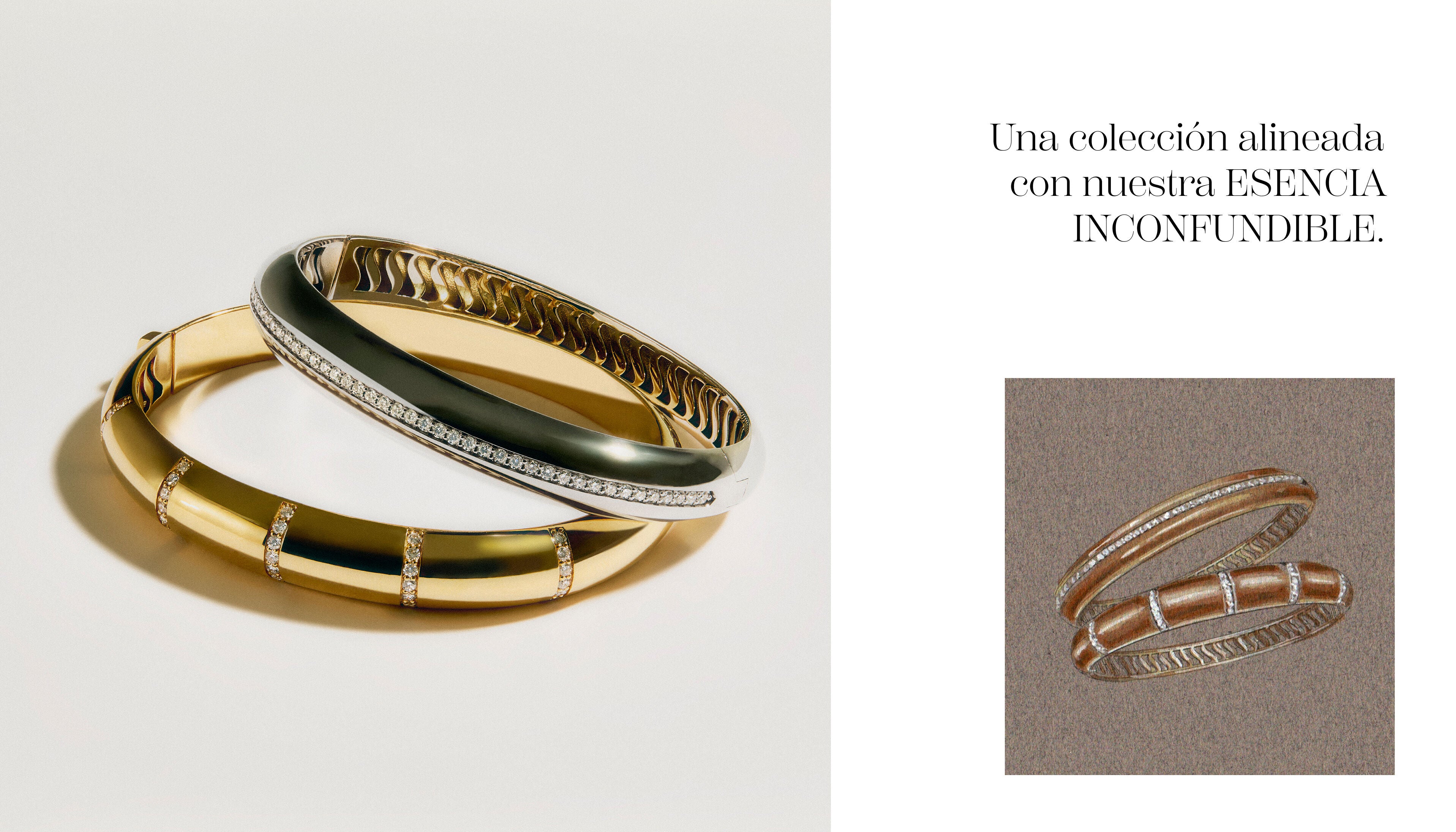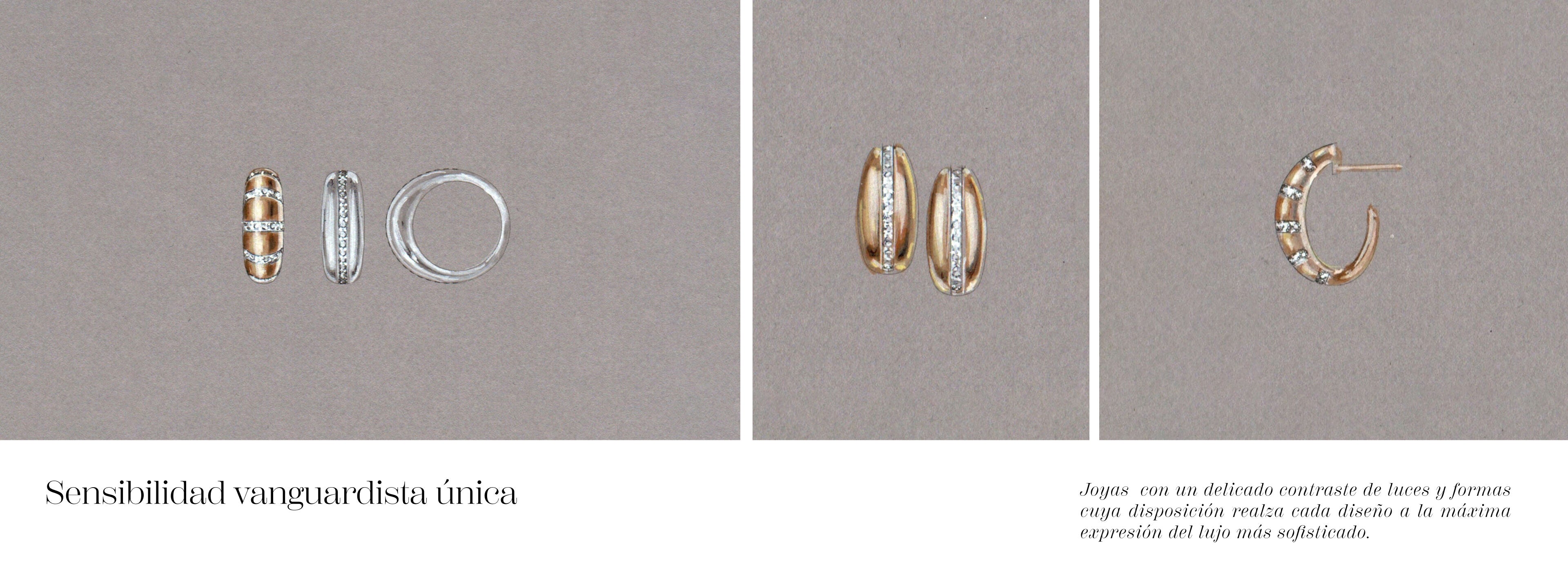 En los anillos, este diseño se materializa en tres modelos: dos versiones más estilizadas en oro blanco y amarillo de 18K, que aportan una estética refinada y ligera, y una tercera versión con mayor presencia, exclusivamente en oro amarillo de 18K, que enfatiza el volumen y la elegancia del diseño.