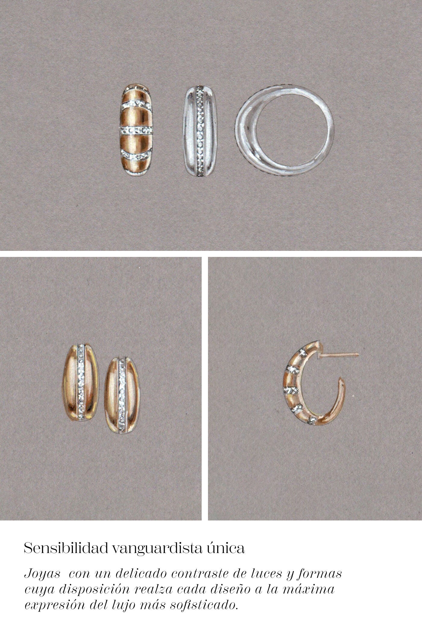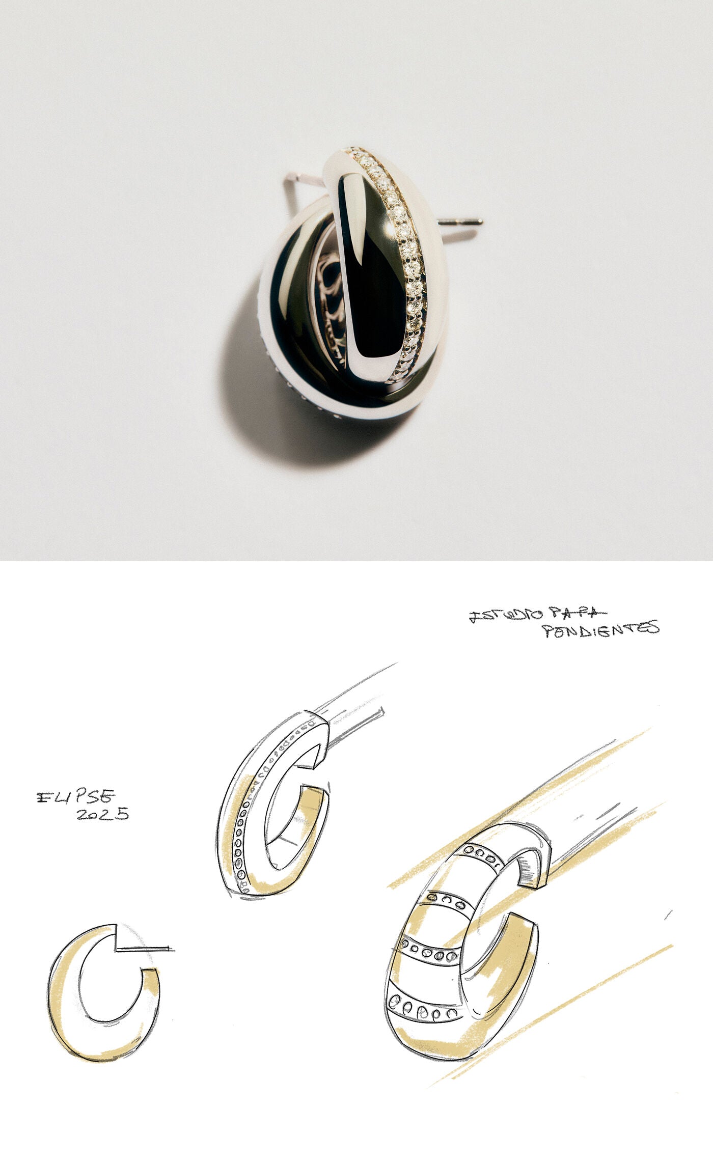 La segunda versión, de diseño más envolvente y dinámico, se distingue por la disposición de las hileras de diamantes en un movimiento circular vertical que converge en un punto central. Esta composición potencia la sensación de fluidez inherente a la elipse, creando piezas con un brillo en constante transformación según la incidencia de la luz, aportando profundidad a cada joya.