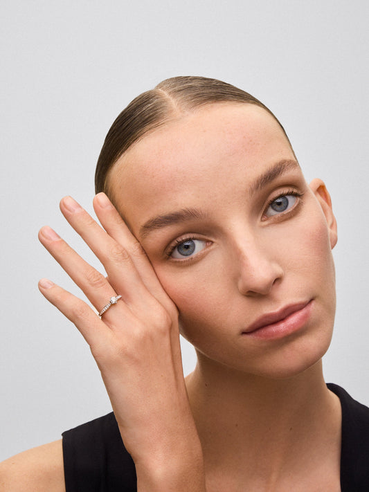 • Anillo de oro blanco de 18K con diamante central en talla brillante de 0,1 cts y 28 diamantes en talla brillante con un total de 0,2 cts