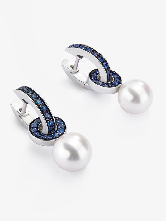 • Pendiente de doble aro de plata 925 combinado con perla akoya de 8,5 mm y zafiro