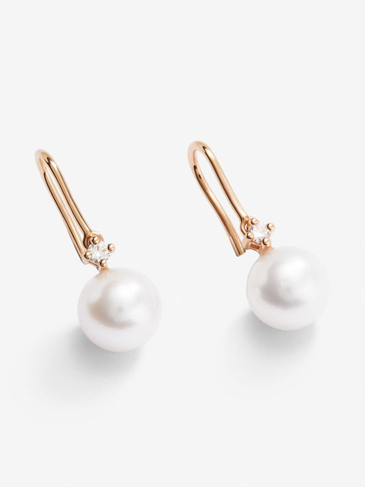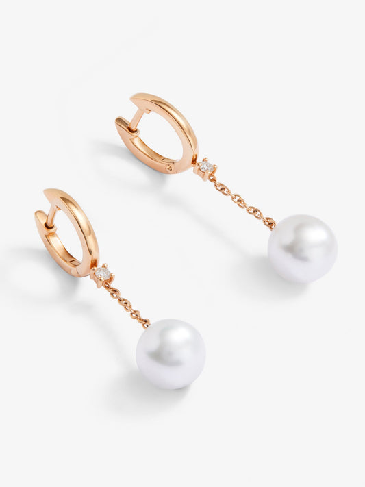 Pendientes de aro y cadena de oro rosa de 18K con diamantes blancos en talla brillante de 0,07 cts y perlas akoya 8,5 mm