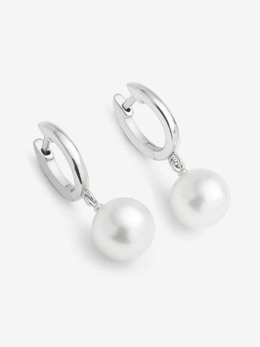 • Pendiente de aro de oro blanco de 18k con colgante de perla australiana de 9 mm y diamante