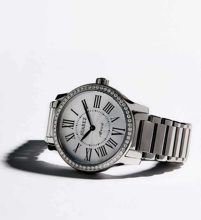 Reloj de acero inoxidable y diamantes blancos en talla brillante, con cristal de zafiro y movimiento de cuarzo