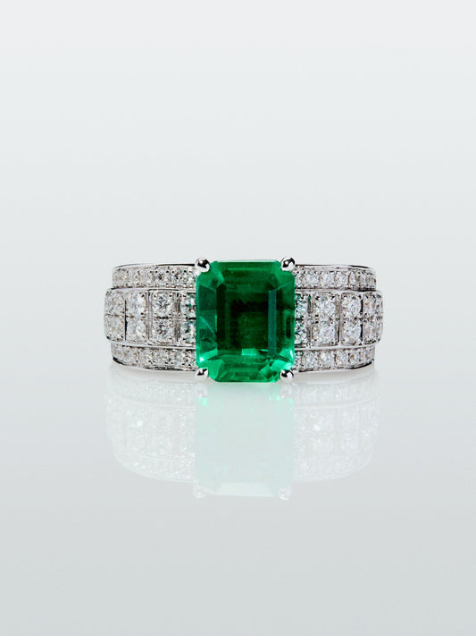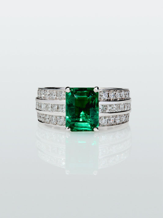 18K white gold ring with octagonal cut emerald of 2.522 cts, 44 brilliant cut diamonds with a total of 0.81 cts and 12 princess cut diamonds with a total of 0.76 cts