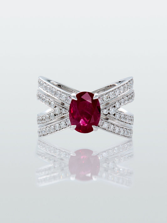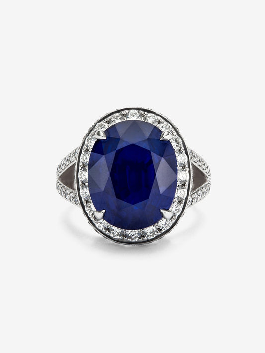 18K white gold ring with oval-cut royal blue sapphire of 12.64 cts and border and arm of 93 diamonds with a total of 1.74 cts