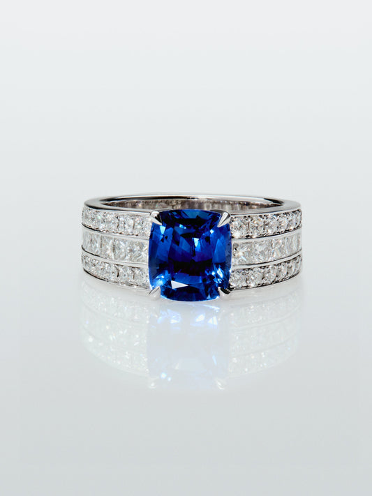 18K white gold ring with cushion-cut royal blue sapphire of 3.217 cts, 50 brilliant-cut diamonds with a total of 1.05 cts and 8 princess-cut diamonds with a total of 0.48 cts