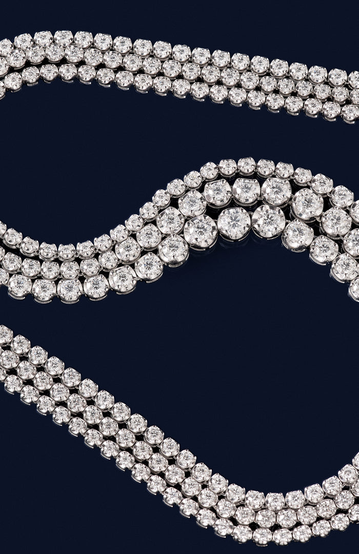 Desde su creación, la rivière se ha ido estableciendo como sinónimo de elegancia absoluta tanto en pulsera como en collar. Un icono que ha vivido distintos momentos de esplendor: desde la corte francesa del XVIII, cuando se convirtió en pieza indispensable entre la nobleza; pasando por los años 20, cuando dialogaba con el espíritu del Art Déco; hasta los 70, cuando volvió a situarse en el centro de la escena como icono imprescindible del lujo atemporal.