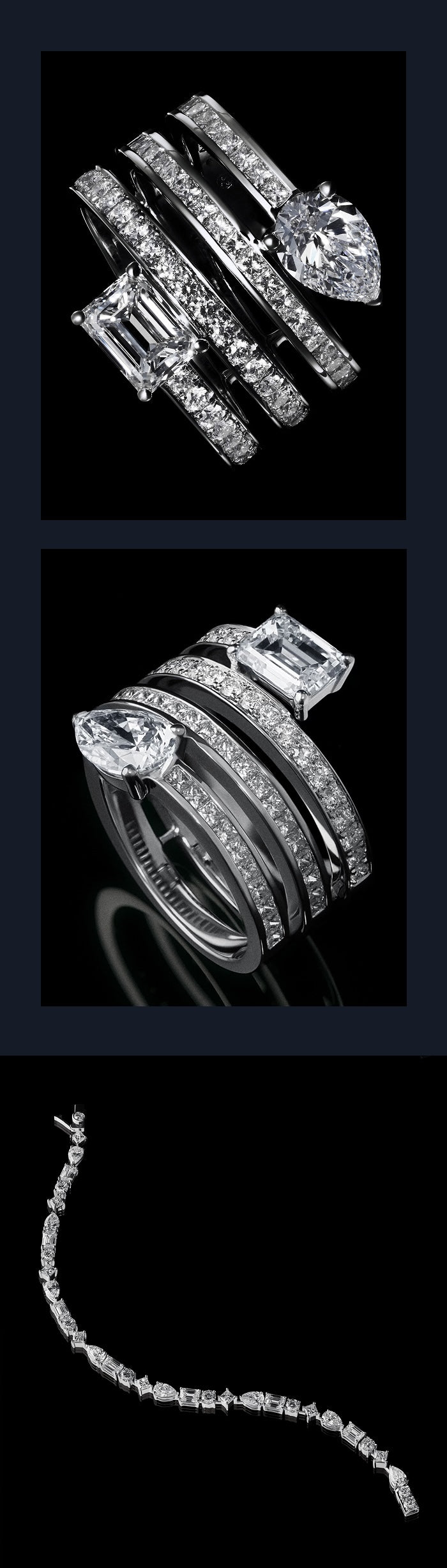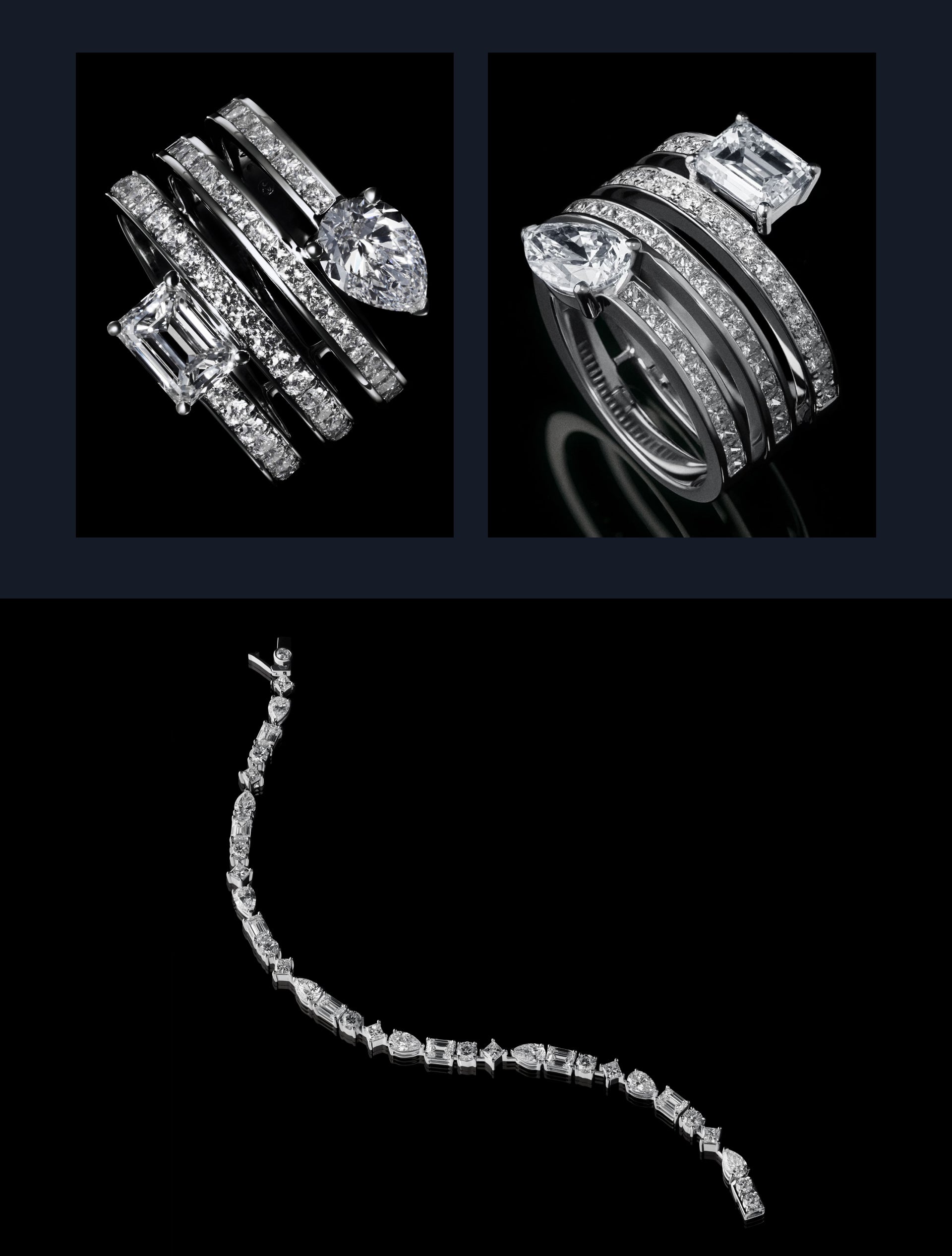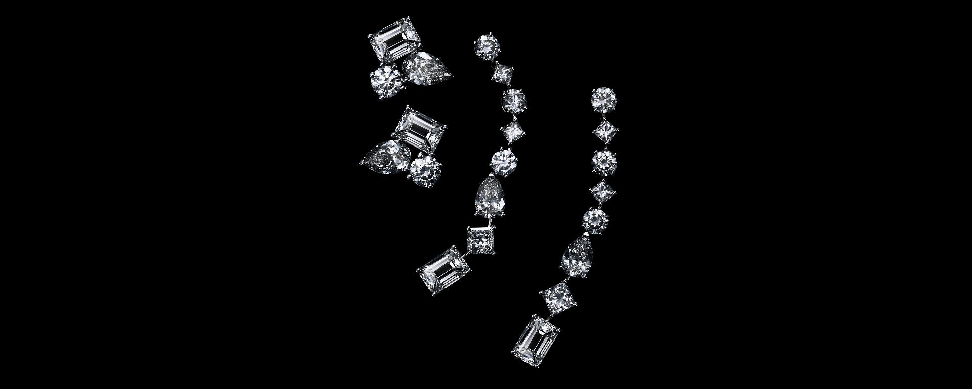 The capsule collection consists of an exceptionally designed necklace, available in four versions of different sizes and lengths; four models of earrings: simple and double dangling, stud and open hoop; a rivière-style bracelet and two rings: a ring with three diamonds set in different sizes and a spiral design with diamond arms and two large stones at the ends.