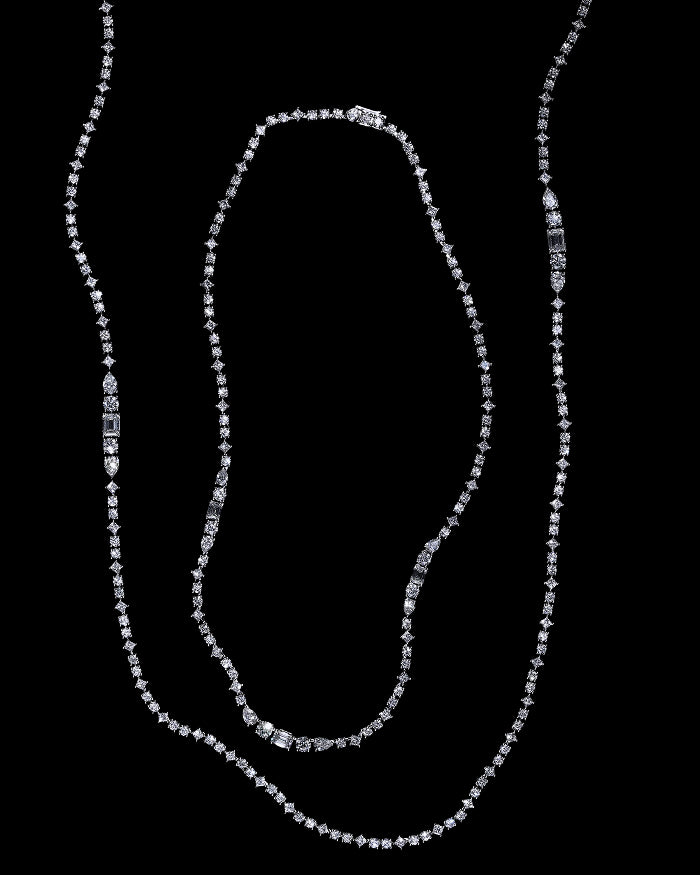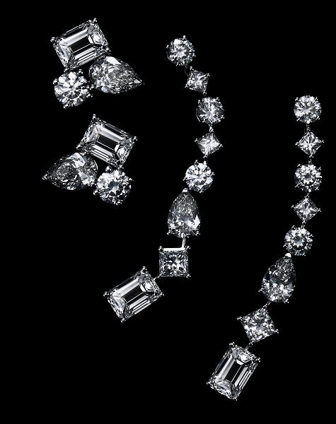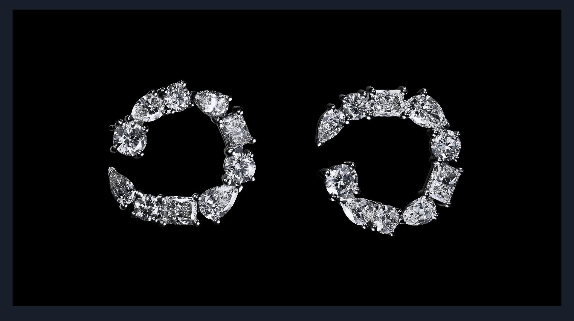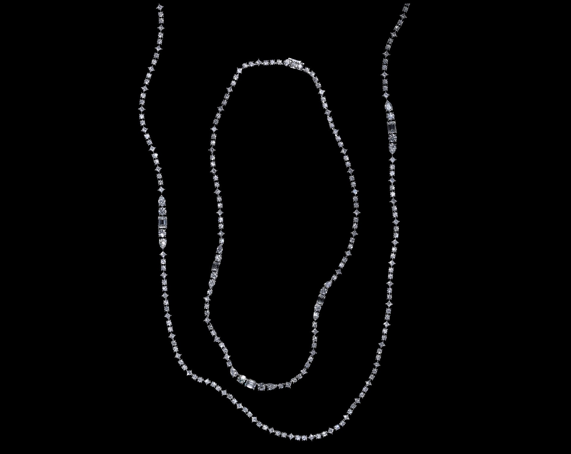 The capsule collection consists of an exceptionally designed necklace, available in four versions of different sizes and lengths; four models of earrings: simple and double dangling, stud and open hoop; a rivière-style bracelet and two rings: a ring with three diamonds set in different sizes and a spiral design with diamond arms and two large stones at the ends.