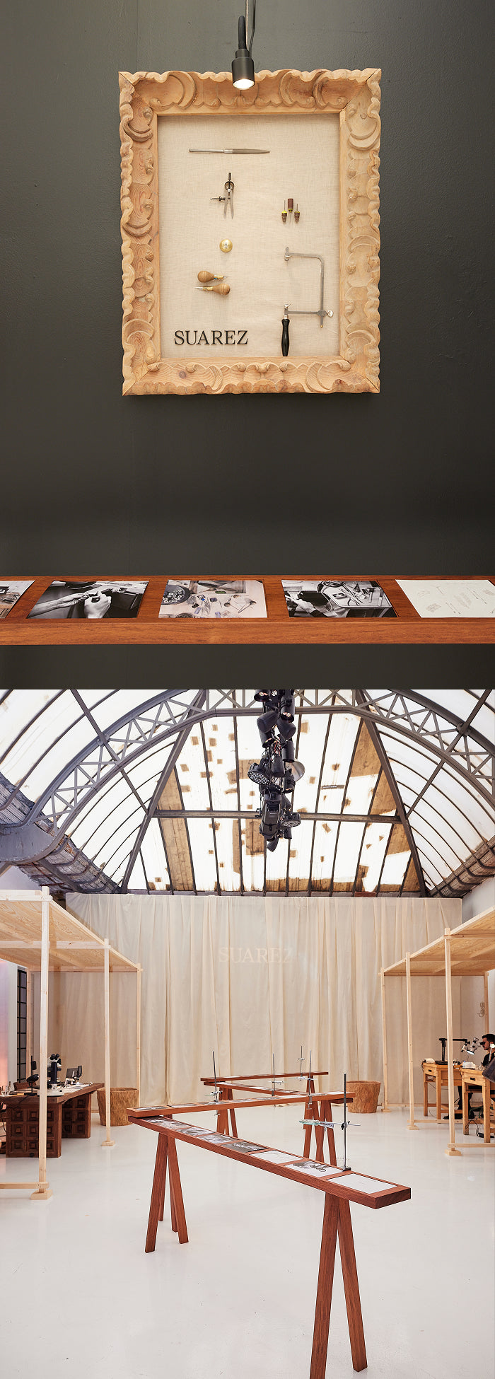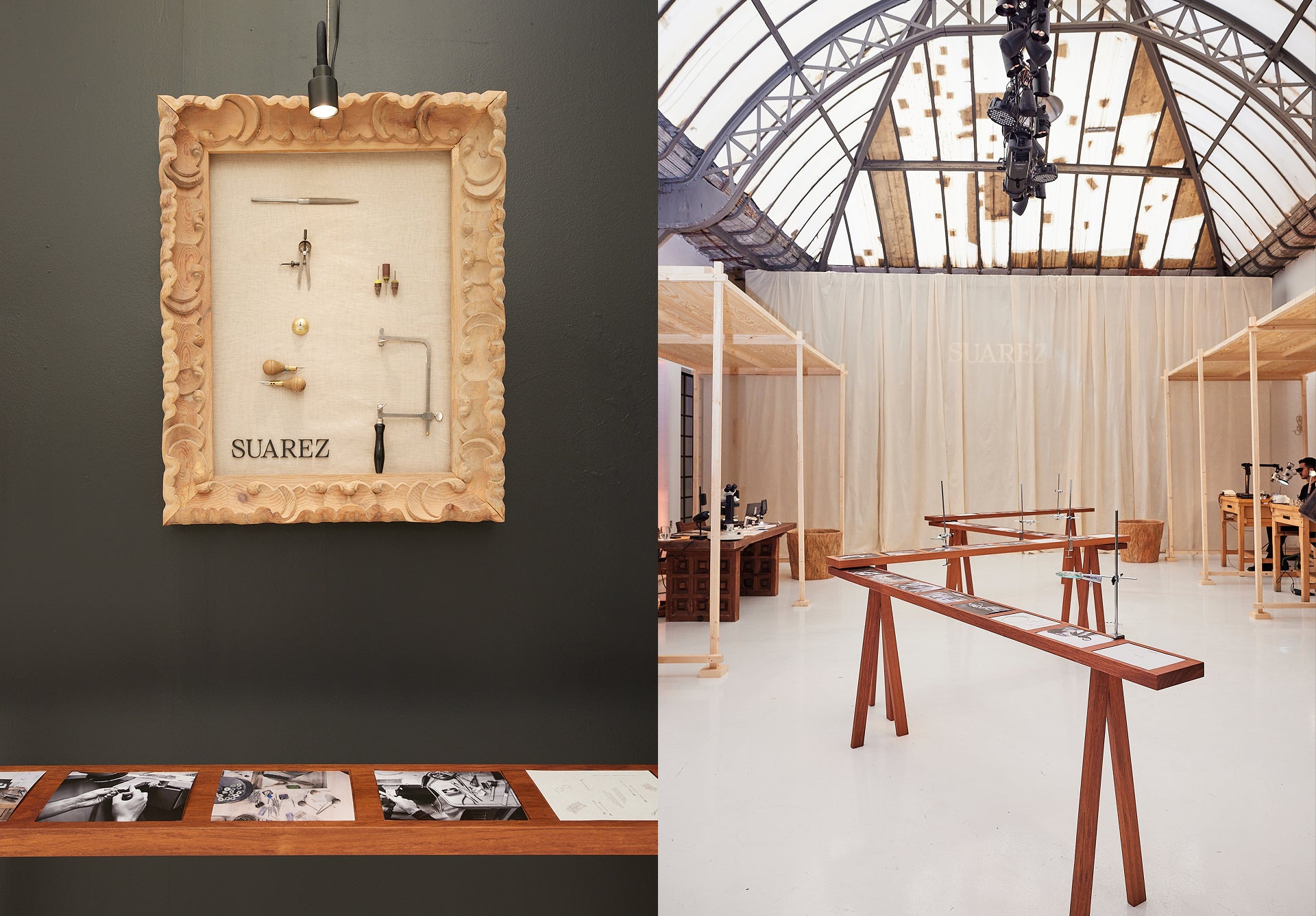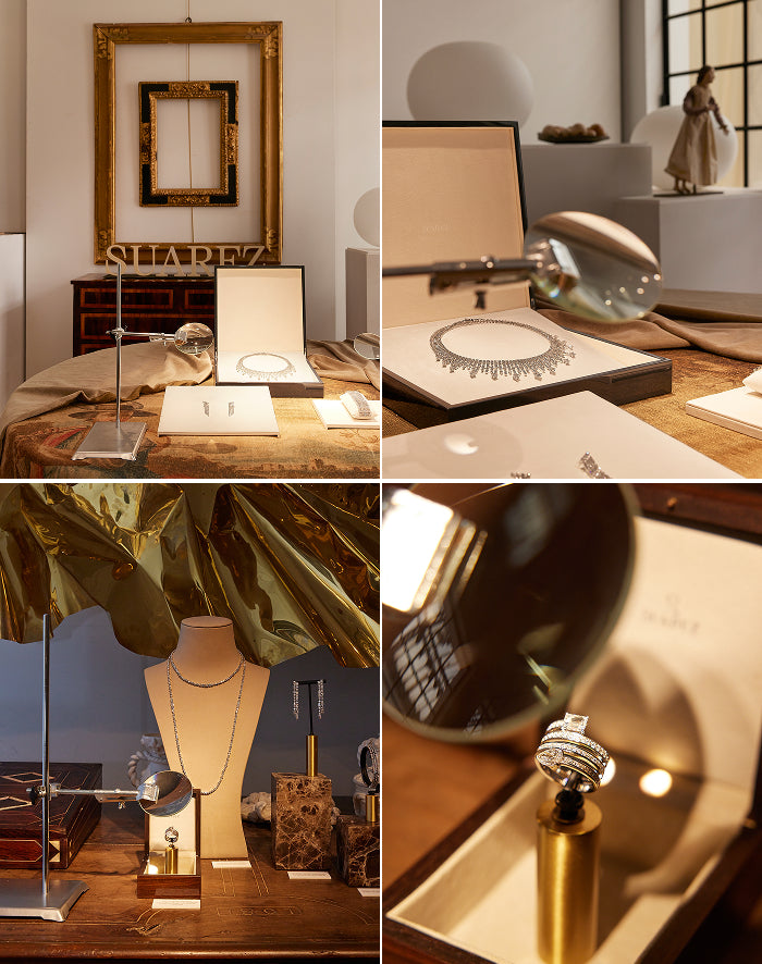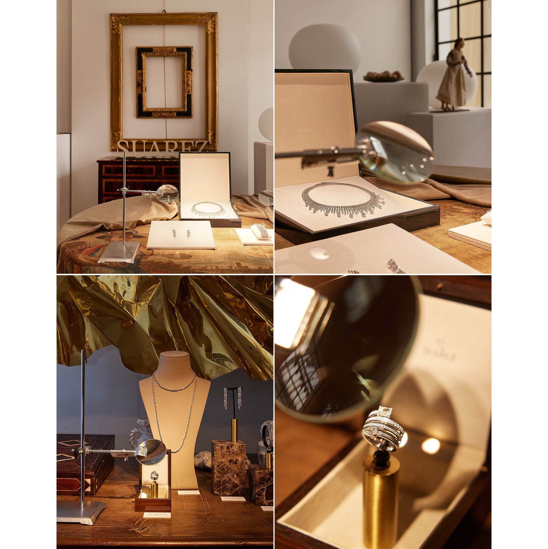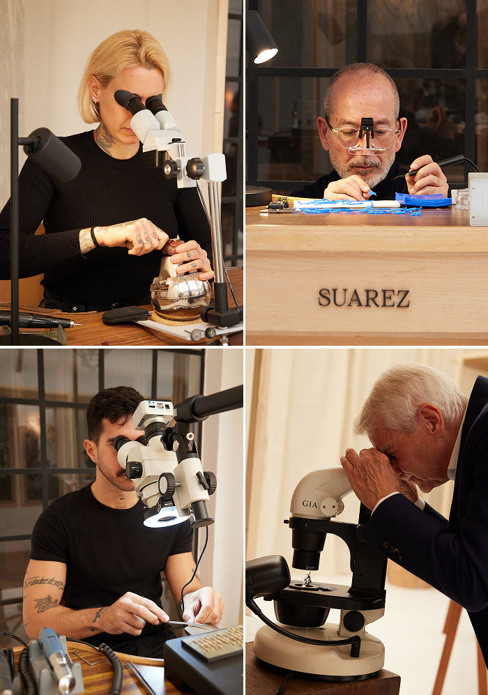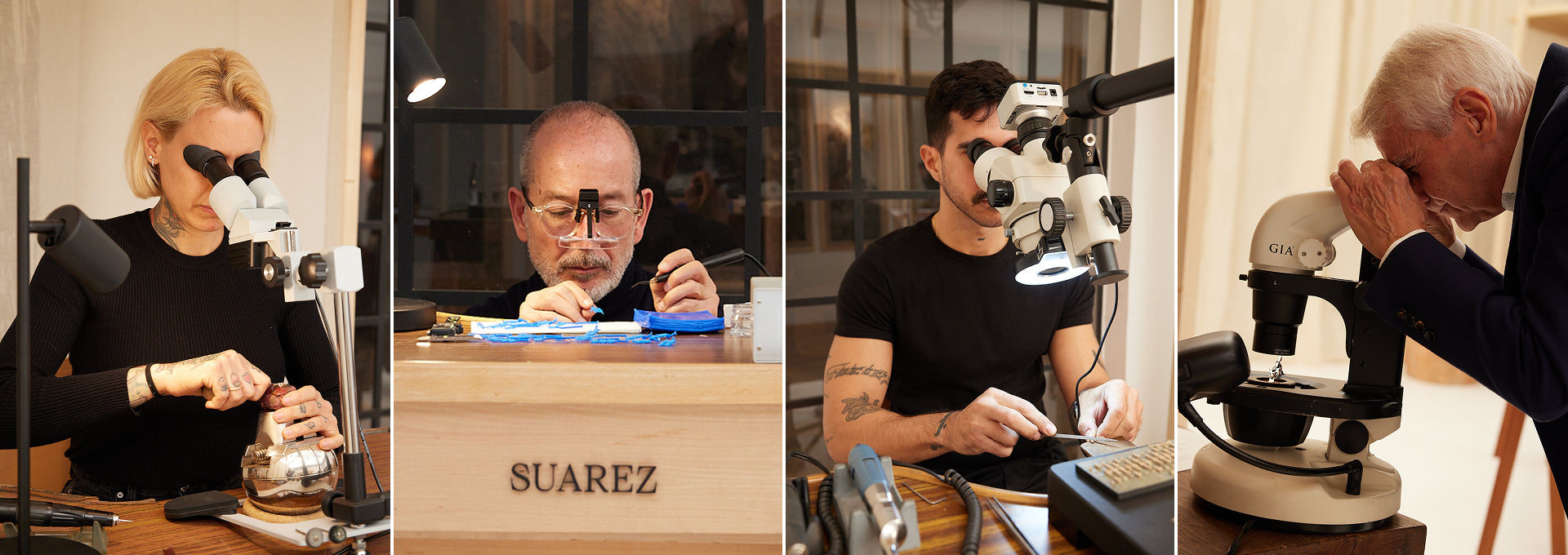 Entre las imágenes, los invitados podían ver a nuestros maestros artesanos trabajando en directo, convirtiendo el recorrido en una experiencia viva. La diseñadora Giovanna de Peverelli, parte esencial de nuestra casa desde hace más de tres décadas, mostraba cómo un gouache o un trazo a lápiz pueden contener ya la promesa de una joya para siempre. A su lado, Rubén García, director de diseño y miembro de una familia históricamente vinculada a Suarez, compartía la evolución de esas ideas, explicando cómo la tradición y la innovación conviven en cada una de nuestras colecciones.