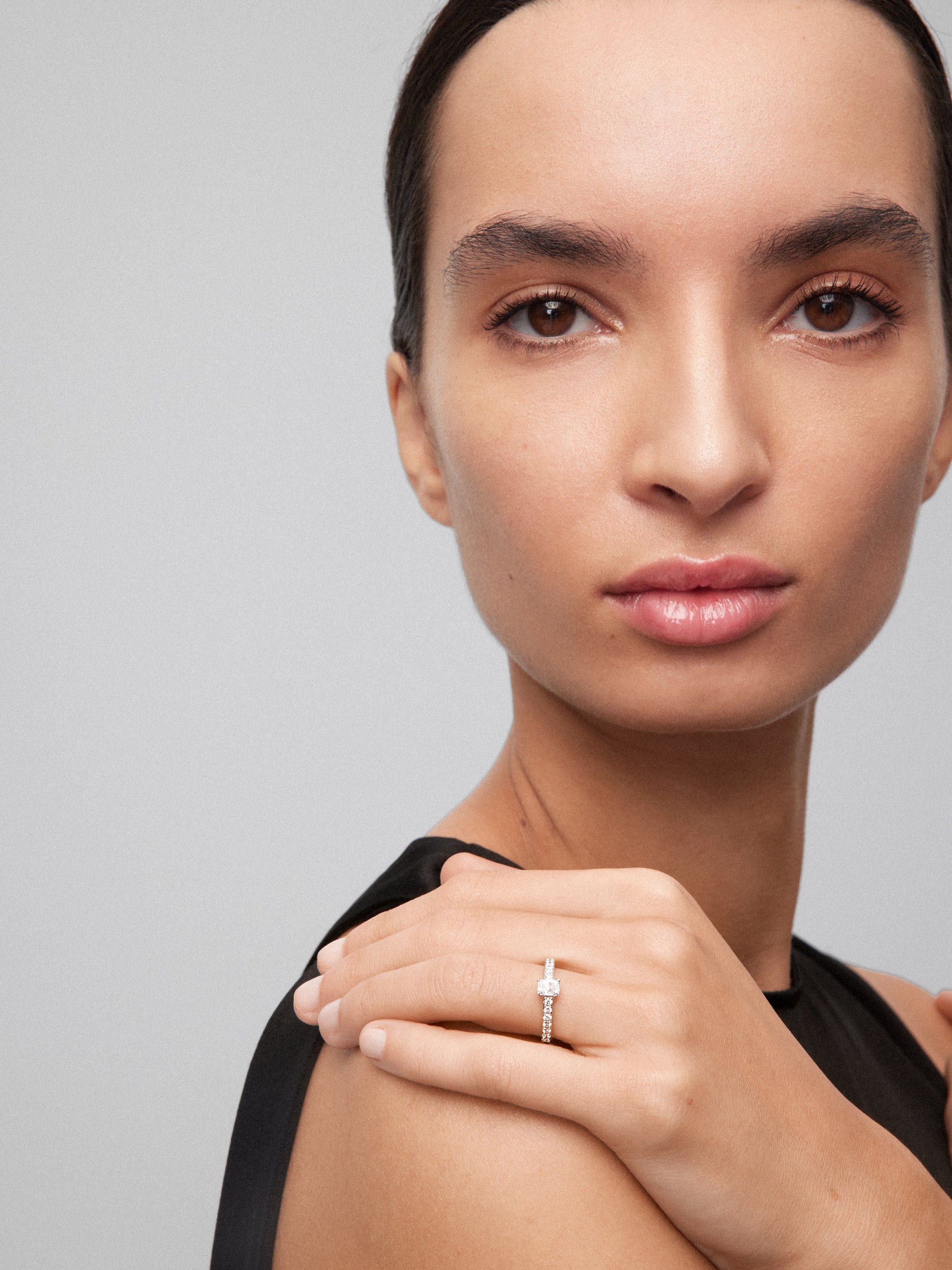 El oro blanco y los diamantes en talla esmeralda y brillante se fusionan en esta sortija de la colección Compromiso, dando como resultado una joya que simboliza la pureza, eternidad y belleza del amor verdadero. Esta joya ha sido elaborada utilizando los más selectos materiales, a partir de un cuidado diseño y la mano de obra de nuestros maestros joyeros. Esto convierte la pieza en una obra de artesanía completamente única.