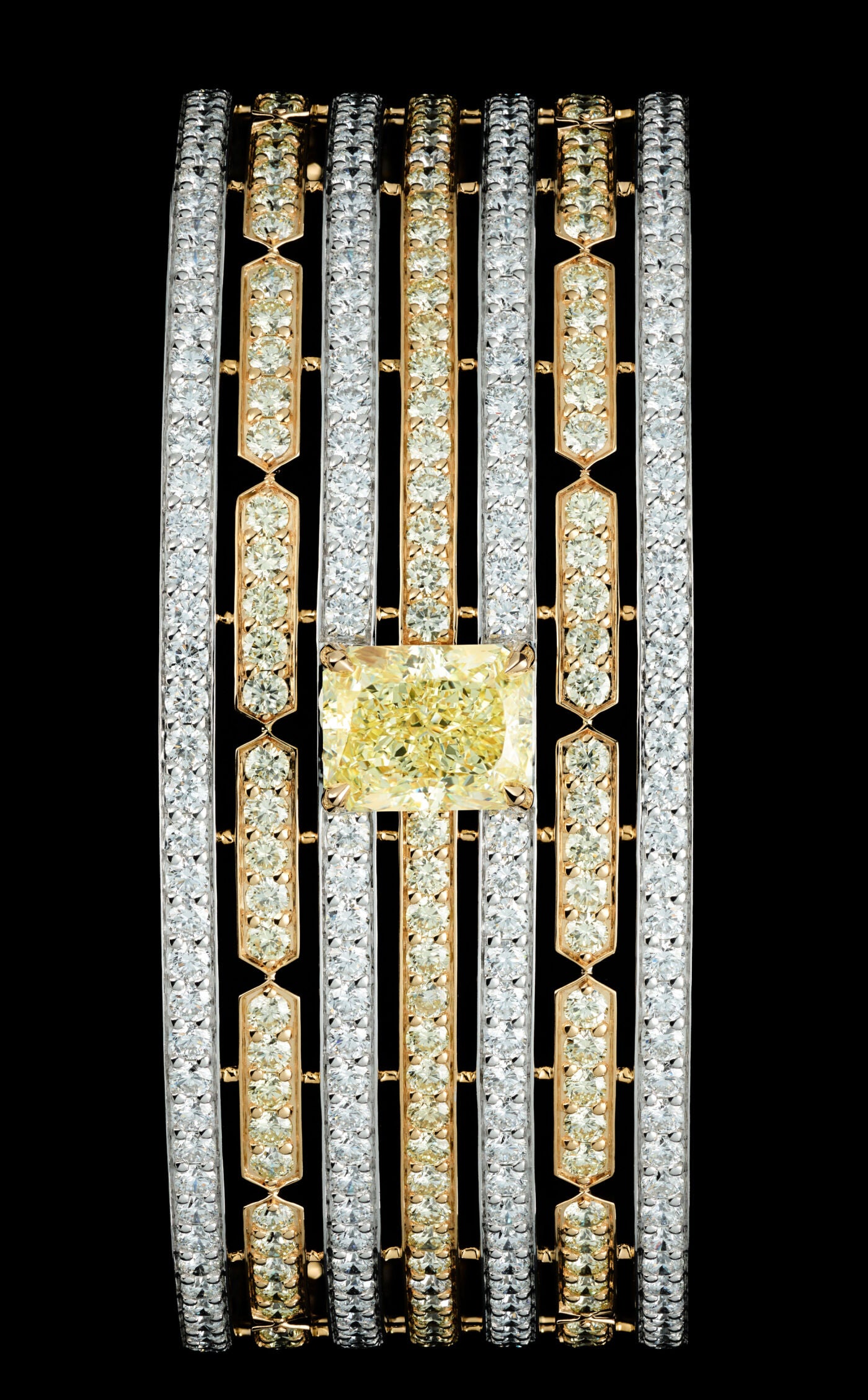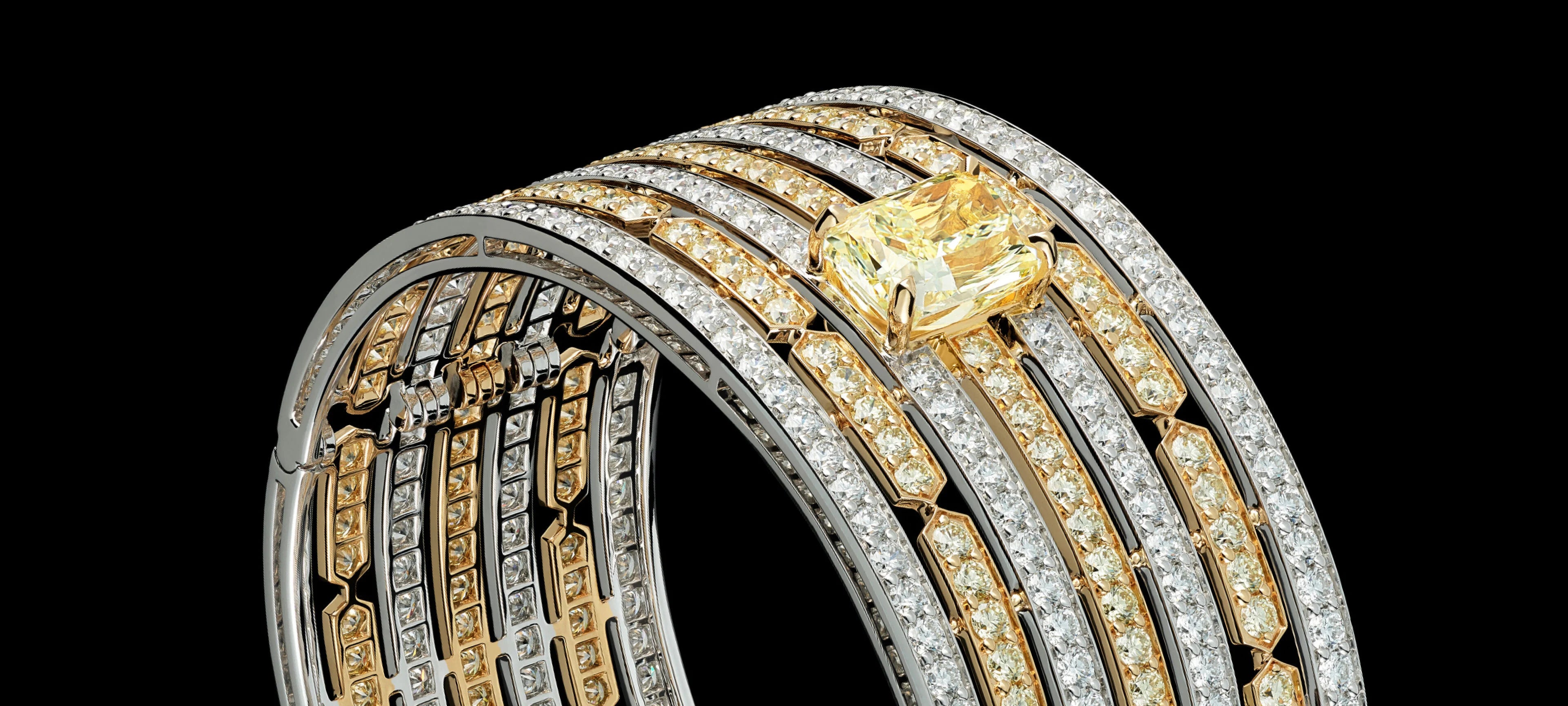 La combinación del oro blanco y amarillo de 18K destaca sobre todo en el brazalete de la colección, que está compuesto por bandas alternas de estos metales y un total de 580 diamantes blancos y fancy contrastados según el metal y un diamante fancy yellow central.