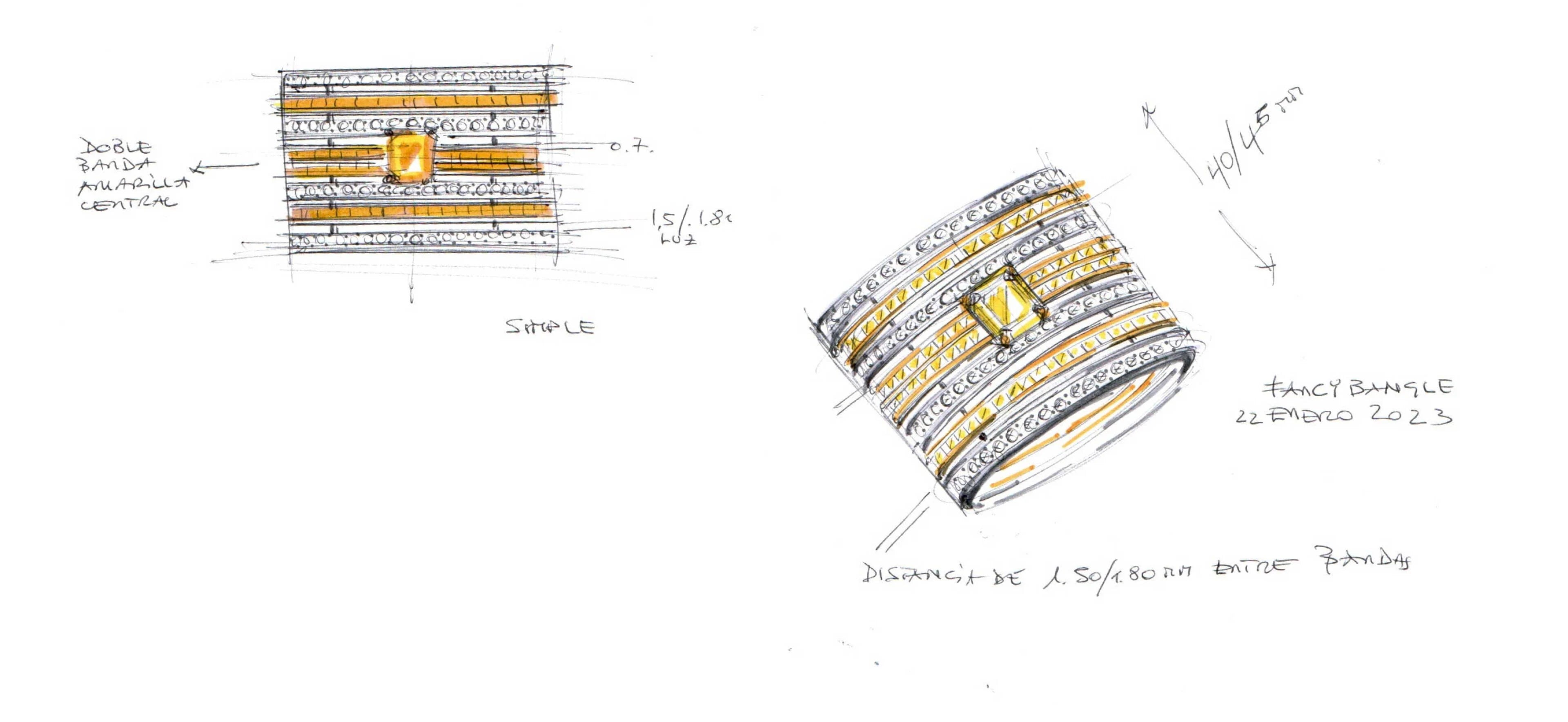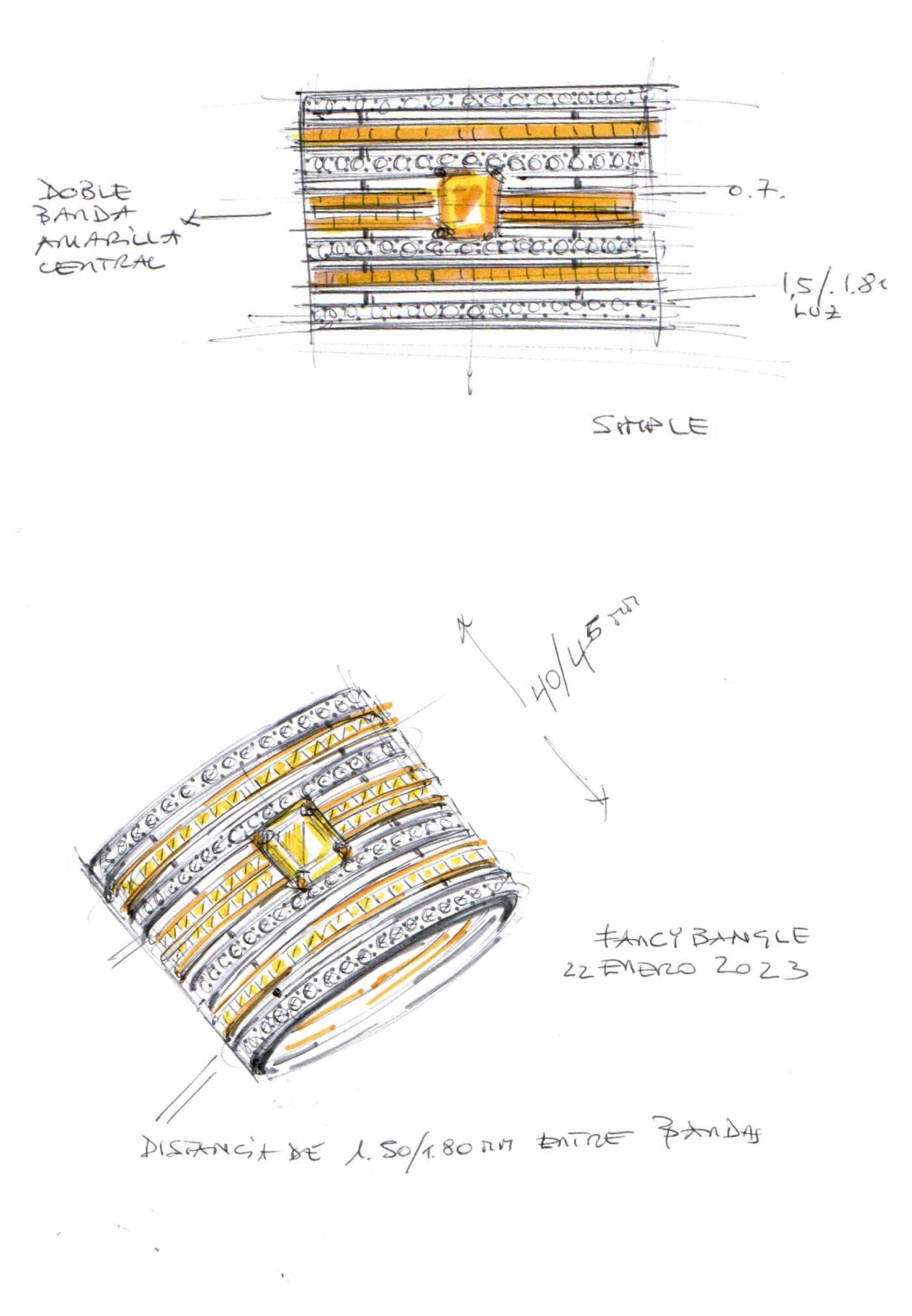 La colección FANCY se completa con dos excepcionales sortijas en diferentes tamaños cuyo diseño está compuesto por tres bandas de diamantes en oro blanco y amarillo y diamantes blancos y amarillos al igual que el brazalete. Esta colección refuerza uno de nuestros pilares fundamentales como casa de joyería: la materia prima. Un valor que seguimos ensalzando debido a que la propia familia Suárez sigue viajando personalmente a los mercados internacionales de gemas para seleccionar personalmente los mejores ejemplares de piedras preciosas.