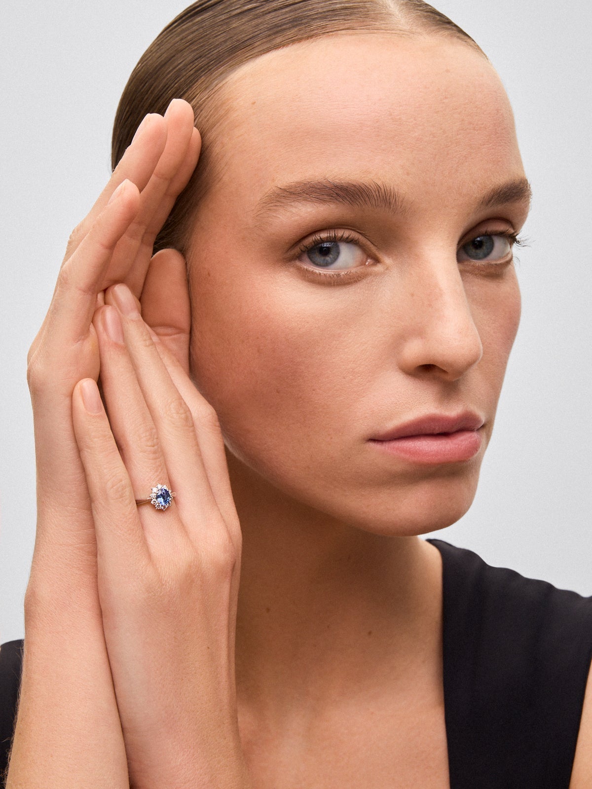 Anillo de oro blanco de 18K con zafiro azul en talla oval de 0,78 cts y diamantes en talla brillante con un total de 0,32 cts